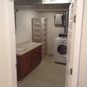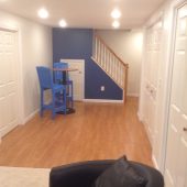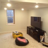 Another example of our continued success in making our repeat customers continue to come back to us for their future home improvement needs. We initially built a beautiful 4-season sunroom for these homeowners and then they decided to turn their under utilized basement space into a beautiful, warm, cozy family space for their family. Our talented design team worked with the homeowners to incorporate all their needs – spacious laundry room area, closet space for storage, and a main living area that would allow for a space for playing games and another space for watching TV and movies – mission accomplished! The homeowners are thrilled with their new space.