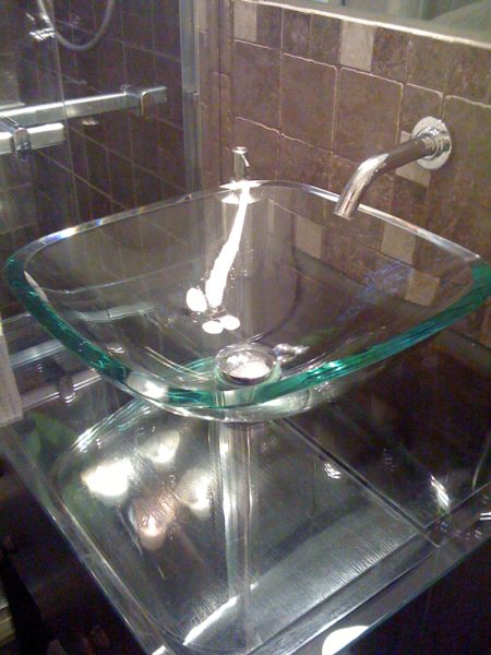 Tempered glass is mostly used for vessel sinks. Vessel sinks sit on top of the countertop and are reminiscence of old washbasins. Tempered glass is more durable than regular glass. While it can break under tough treatment, it will not chip, crack, or shatter. It is also resistant to heat.