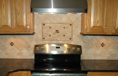 Many backsplash materials have coordinating trim (decorative borders and listellos) so that edges can be finished or a βpicture frameβ area can be enclosed. Within the βpicture frameβ you can use the same material in a different layout pattern (ex: vertical, horizontal, herringbone, chevron, etc.). You could also use a completely different type of material, or a mural/medallion could be added. These βpicture frameβ or showcase areas are typically installed above the stove or the sink. Many backsplash materials have coordinating decorative pieces or ornamental/embellished elements that are meant to be added throughout the backsplash.